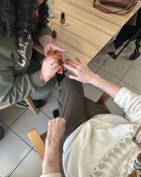 Ce lundi, Rahma, qui participe régulièrement à ces rencontres, a souhaité offrir un moment de bien-être aux résidents. Avec beaucoup de douceur et d’attention, elle a proposé de réaliser des manucures. Ce geste simple s’est rapidement transformé en un véritable temps de détente et de convivialité.