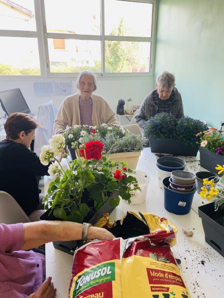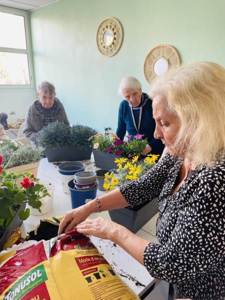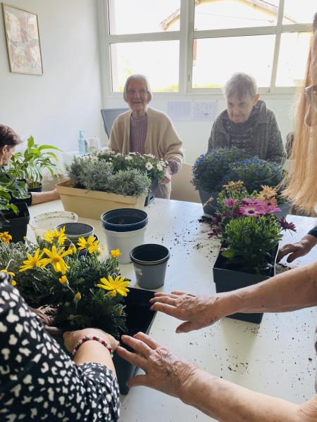Chacun a pu mettre la main à la terre : plantation de fleurs, rempotage et petits soins apportés aux plantes ont rythmé cette belle journée. Les résidents ont participé avec enthousiasme, heureux de renouer avec des gestes simples et apaisants.
