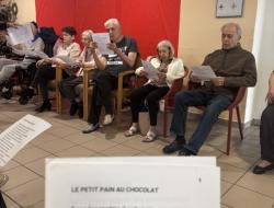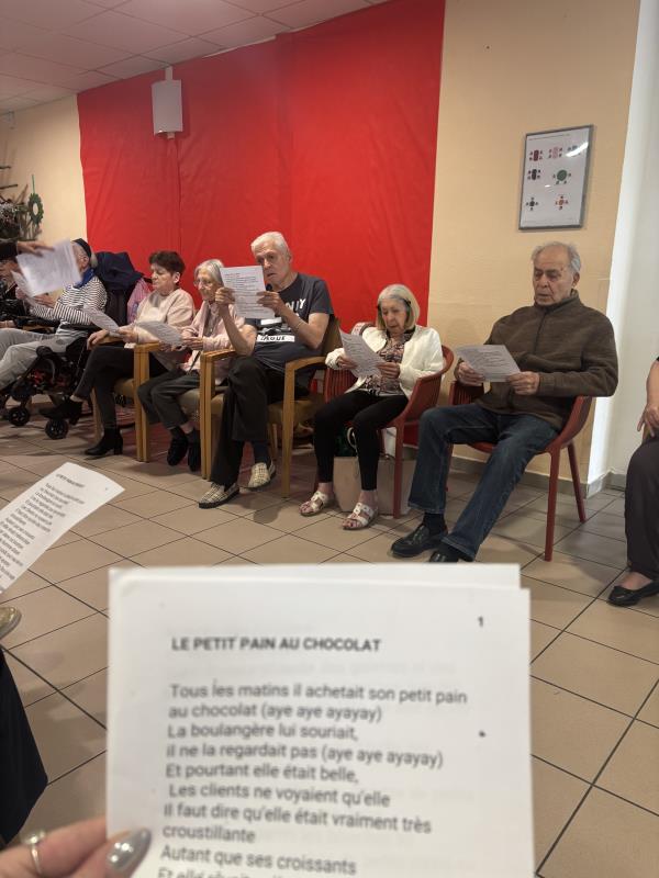 Dans une ambiance festive et pleine d’entrain, les résidents qui participent à l'atelier chorale ont fait chanter l’ensemble des participants autour de chants connus et appréciés de tous. Les autres résidents, très impliqués, ont repris les refrains avec enthousiasme, sourire aux lèvres.