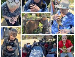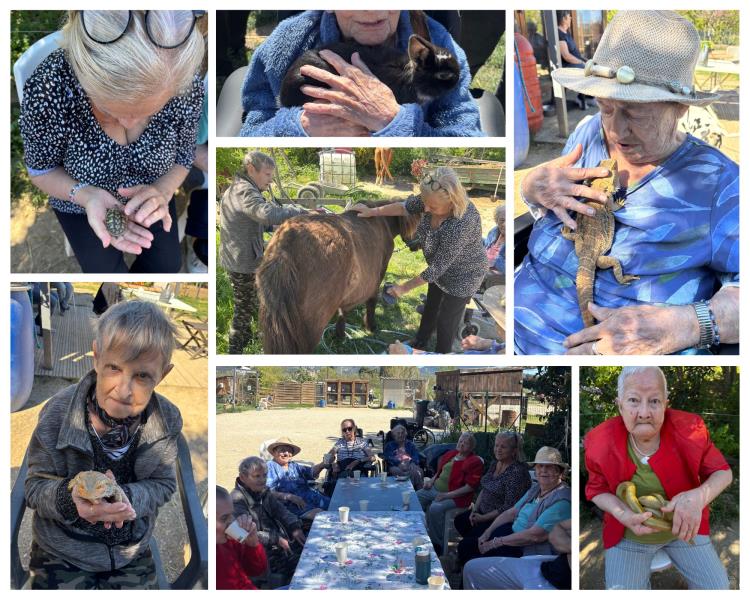 Nous sommes arrivés à midi, l'heure parfaite pour un pic nique au soleil ! Tout au long de la journée, les résidents ont pu profiter du grand air et observer les animaux de la ferme (cochons d'inde, poules, chevaux, ânes, moutons, perroquets, lézards, serpents...). Certains ont même eu l’occasion de les approcher de près, ce qui a suscité beaucoup de sourires et de souvenirs. Câlins, nourrissage, brossage ont rythmé cette journée. Cette immersion dans un environnement naturel a été très appréciée par tous.